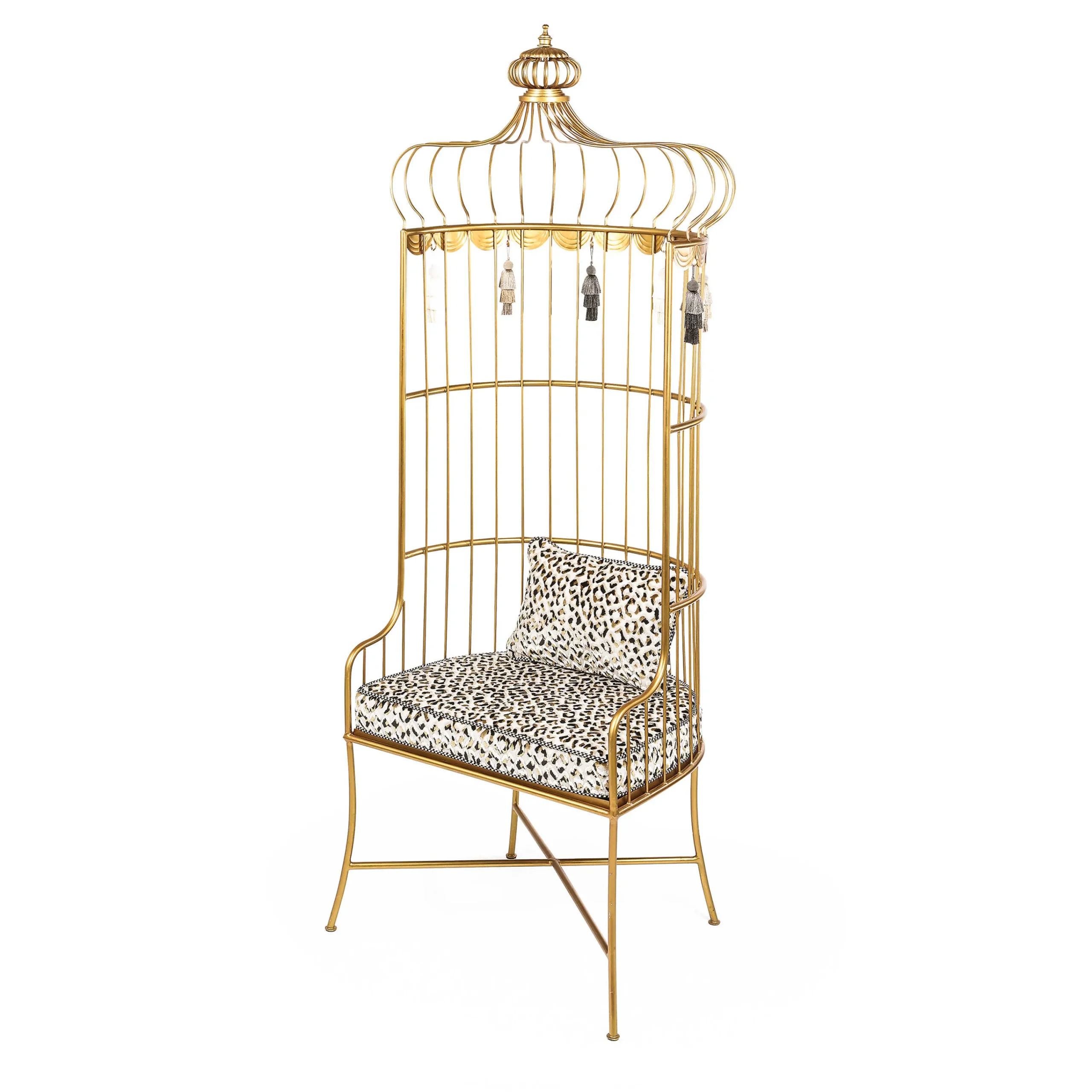 Allow Us To Tweet About Our Aviary Chair, A Gilded Perch Like No Other. Its Uniquely Shaped Powder-Coated Iron Frame Offers A Seat Cushion And Toss Pillow That Reverse From Ocelot Pattern To Our Cotton-Linen Blend Courtly Check®, Trimmed With Black And White Checked Cording. The Finishing Touch Are Six Three-Tiered, Ombre-Colored Tassels That Hang Between The Chair’S Metal Swags.