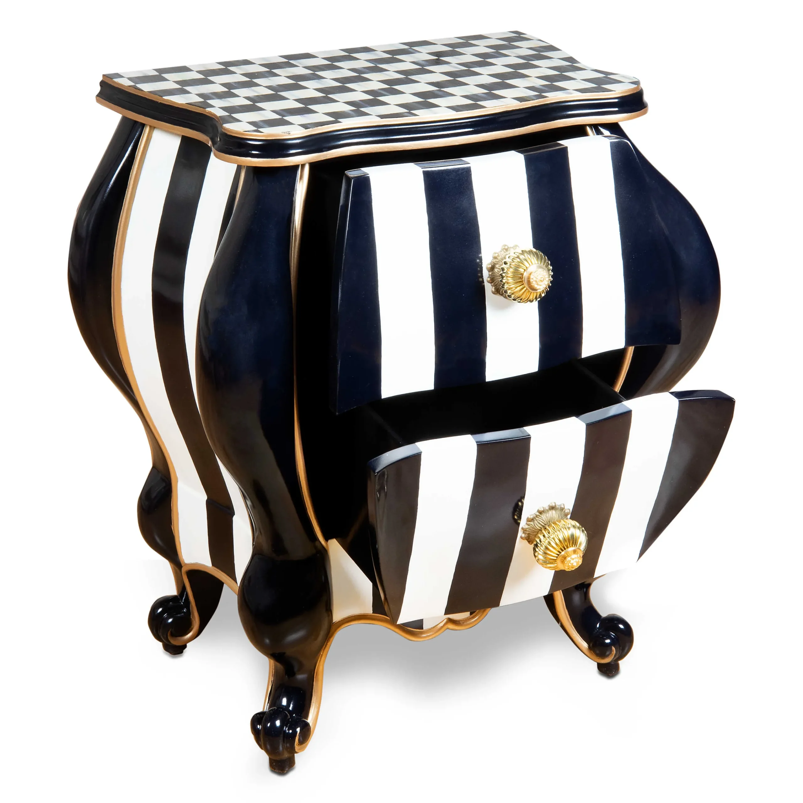 Our Bombastic Bombay Is Black, White, And Stylish All Over. Featuring Hand-Painted Courtly Check® On Top And Black And White Stripes On The Sides And Front, Its Sassy Silhouette Is Trimmed With Golden Paint. Two Drawers Are Accented With Layered Brass Knobs.