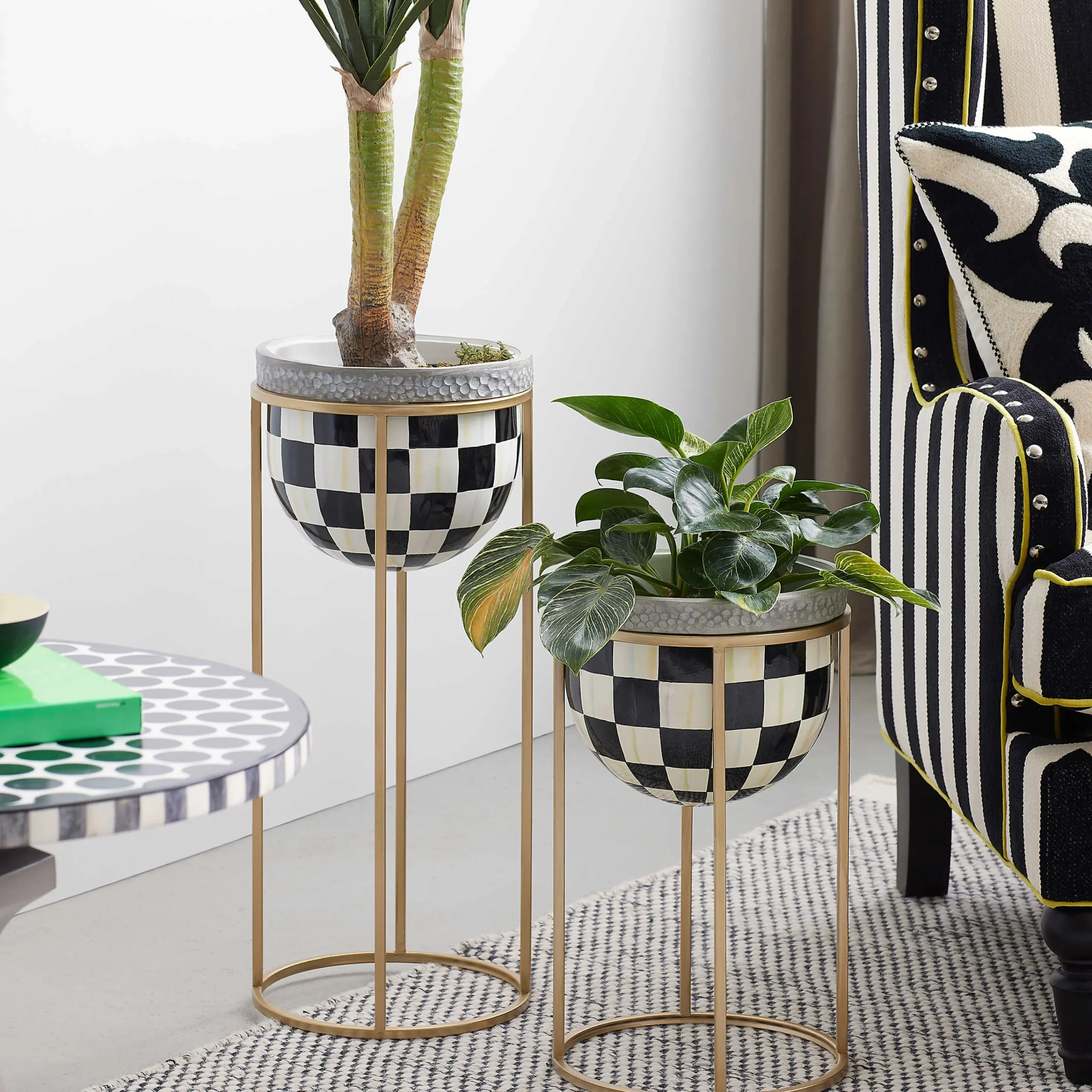 Display Your Plants With Mackenzie-Childs Style In Our Tall Courtly Check® Plant Stand. This Two-Piece Set Includes A Hand-Painted Courtly Check Pot With A Textured Faux Concrete Edge That Fits Into An Accompanying Tall Metal Stand.