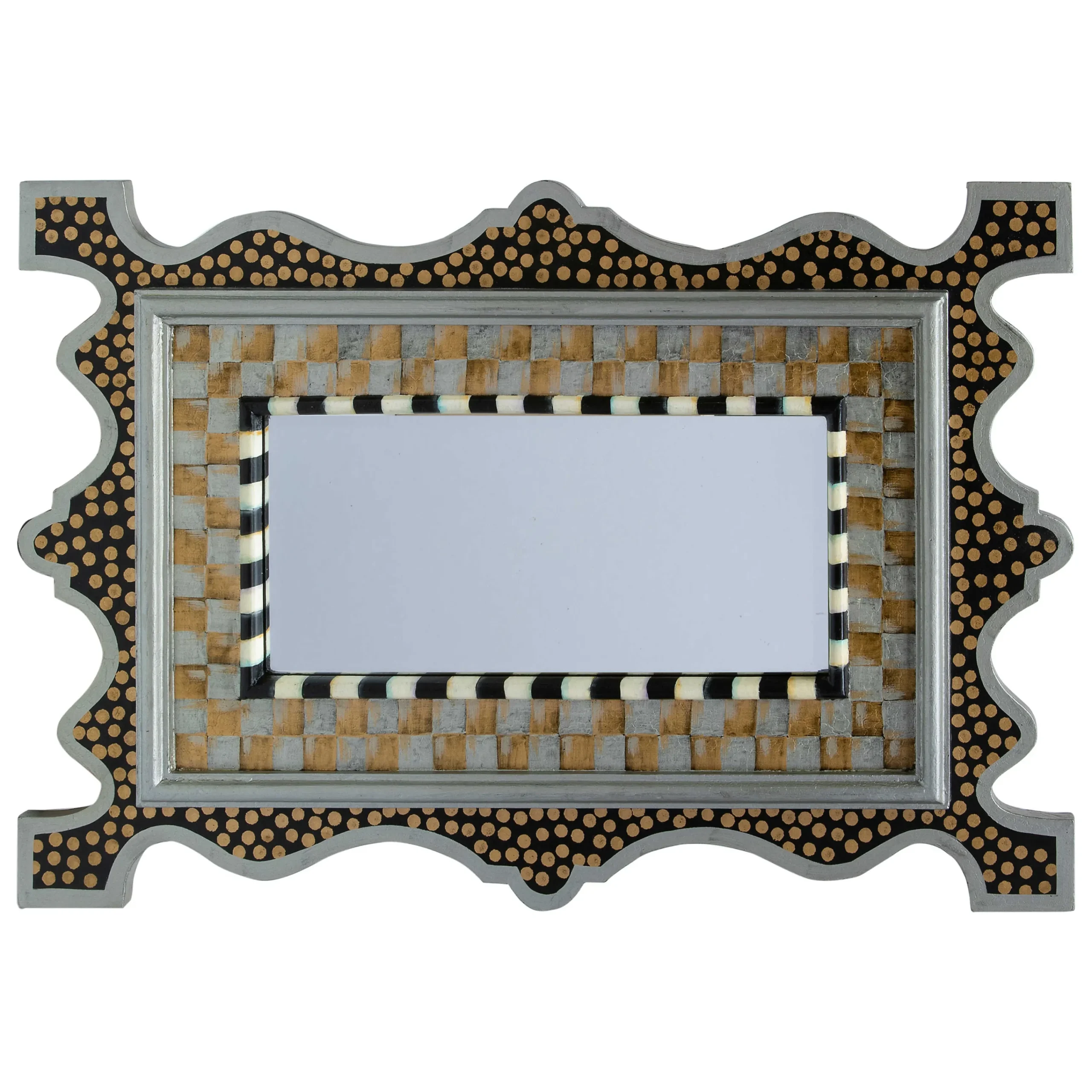 Here’S Looking At You In The Small Golden Hour Mirror. Featuring A Beveled Mirror In The Center, The Frame’S Scrolled Shape Has Platinum Edging That’S Accented With Hand-Painted Dots And Golden Hour Checks. It Can Be Hung Vertically Or Horizontally.