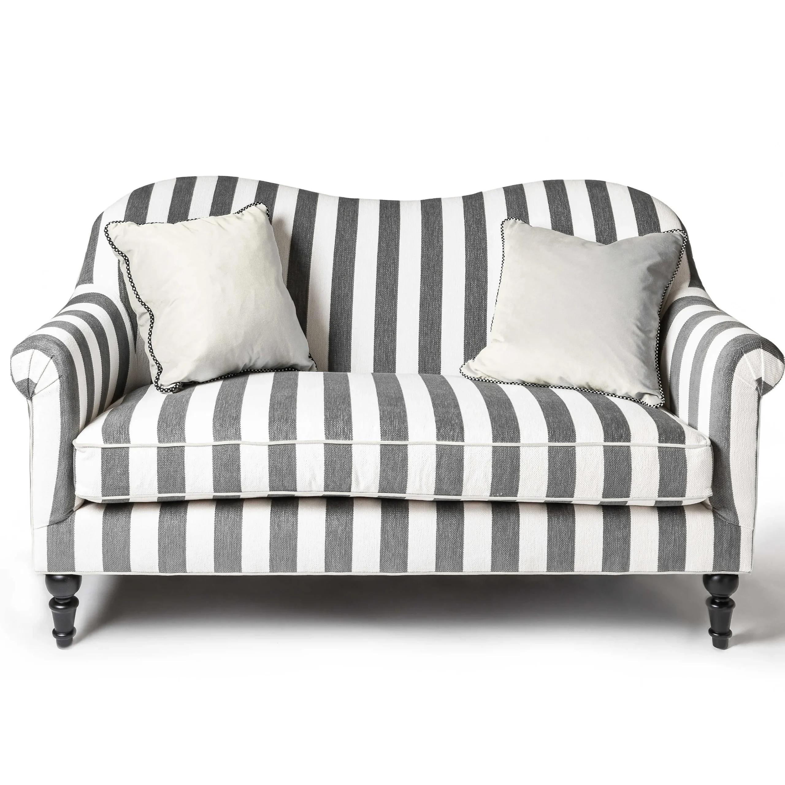 Put Your Showstopping Style Up In Lights. The Chenille Grey Stripe Marquee Loveseat Is A Versatile Striped Silhouette That Stands On Its Own And Mixes And Matches With Solids And Patterns. Features Include Domestic Hardwood Frame, Upholstery-Weight Chenille, Contrasting Welt, And Our Exclusive Fabric Decking Underneath The Loose Seat Cushion. The Finishing Touch Is Two 20″ Square Natural White Pillows With Black And White Checked Cording.