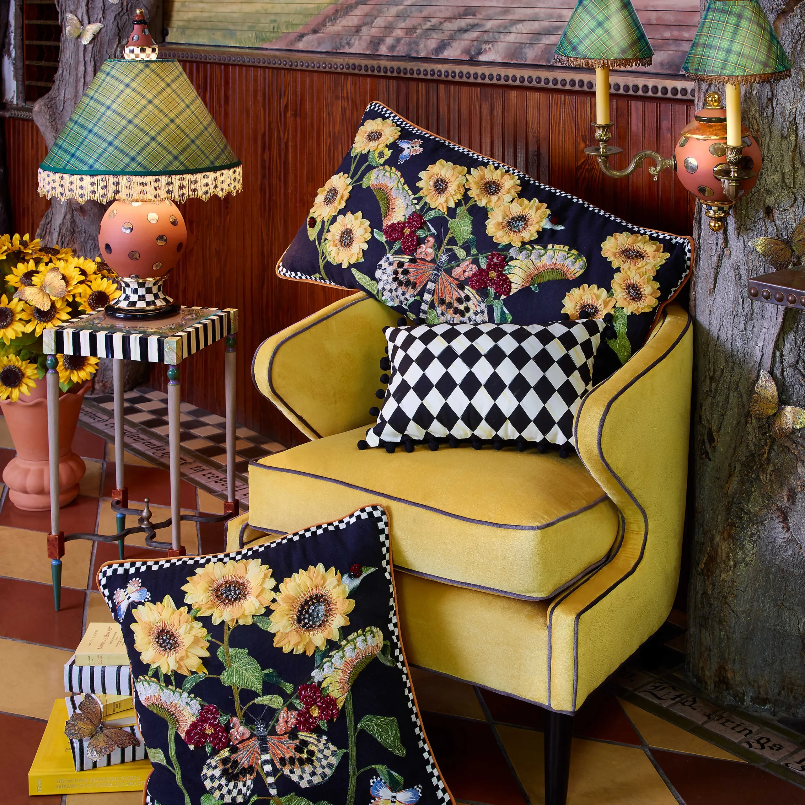 Take A Flight Of Fancy With The Black Monarch Butterfly Square Pillow. Accented With Dimensional Flower Petals, French Knots, And Chenille Stitching, It’S Edged With An Embroidered Black And White Checked Border And Finished With Orange Cording. Sunny And Sensational, It’S Sure To Add Mackenzie-Childs Style Wherever You Choose To Plant It In Your Interiors.