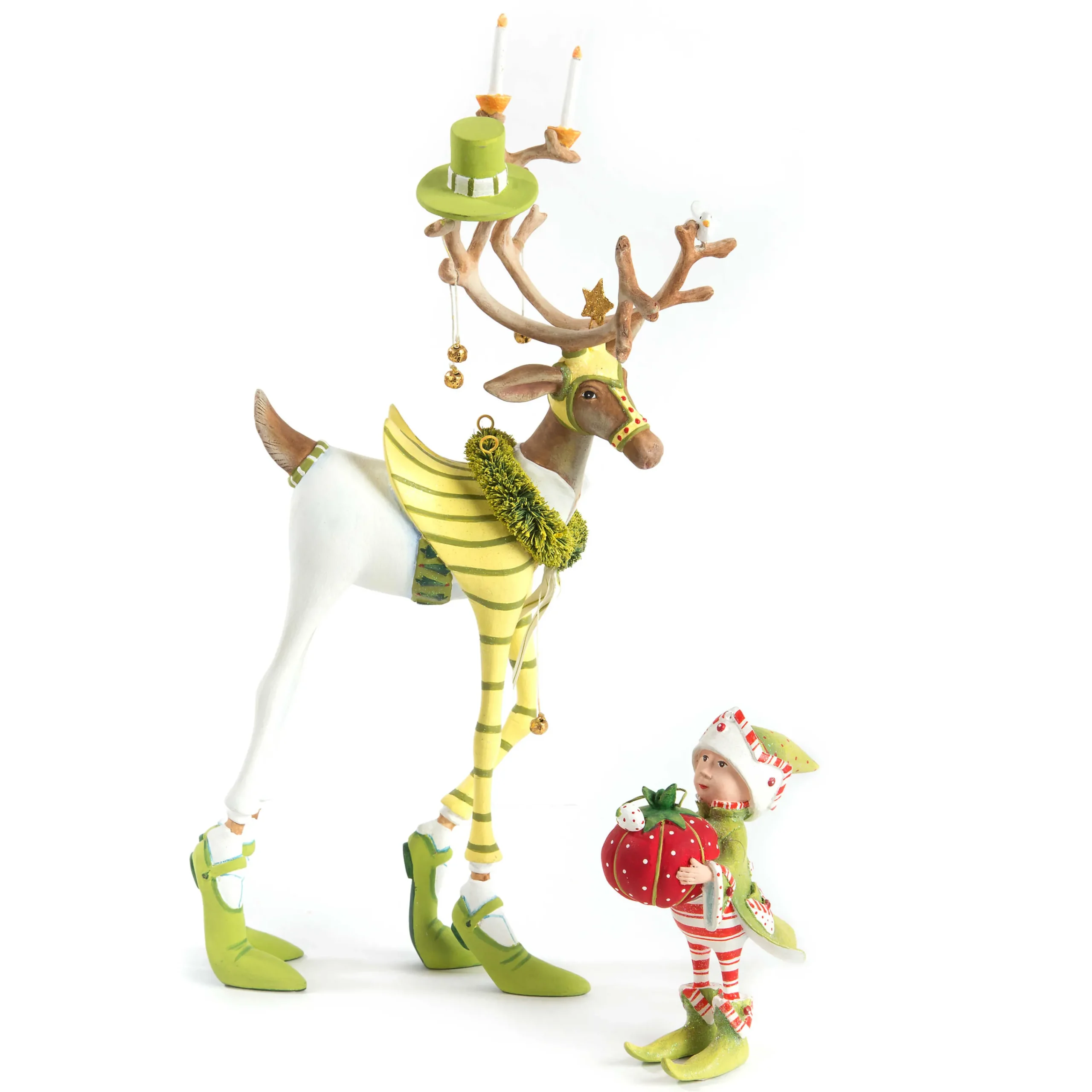 Dash Away, Inspired By The Christmas Classic “‘Twas The Night Before Christmas,” Features Santa’S Eight Reindeer Ready To Take Flight Around The World, Assisted By Their Delightfully Dedicated Elves, Santa, And Mrs. Santa. In His Top Hat And Striped Tails, The Patience Brewster Dash Away Prancer Reindeer Figure Is An Endearing Member Of Our Dash Away Line. He’S Dressed From Antlers To Tap Shoes, Ready To Entertain This Holiday Season.