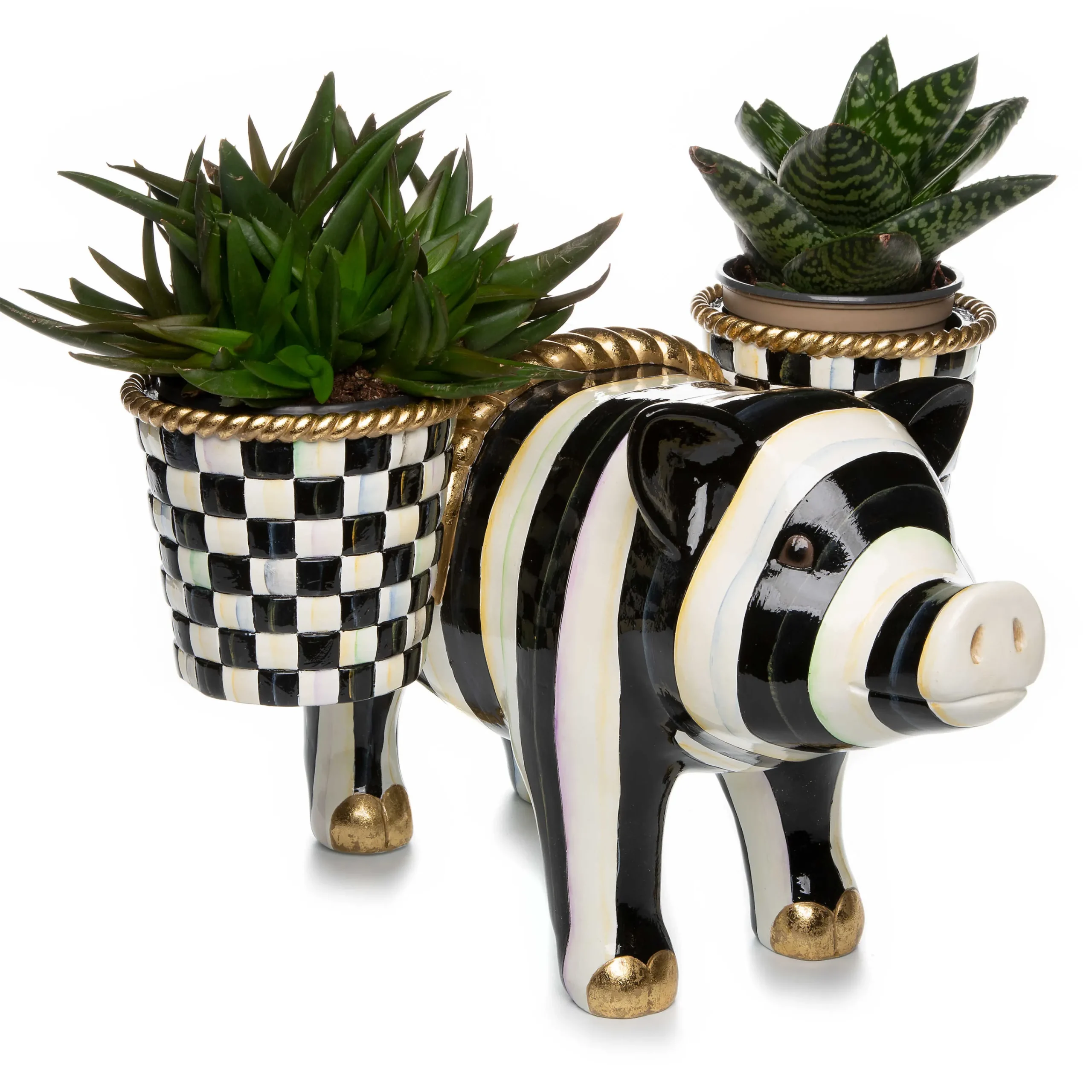 This Pig Saddleback Planter Comes Decorated To Impress With His Black And White Courtly Stripes. He Sports Two Pots Just Right For Planting That Are Decorated With Courtly Checks® And A Bit Of Gilding To Add Glitz To Any Setting.