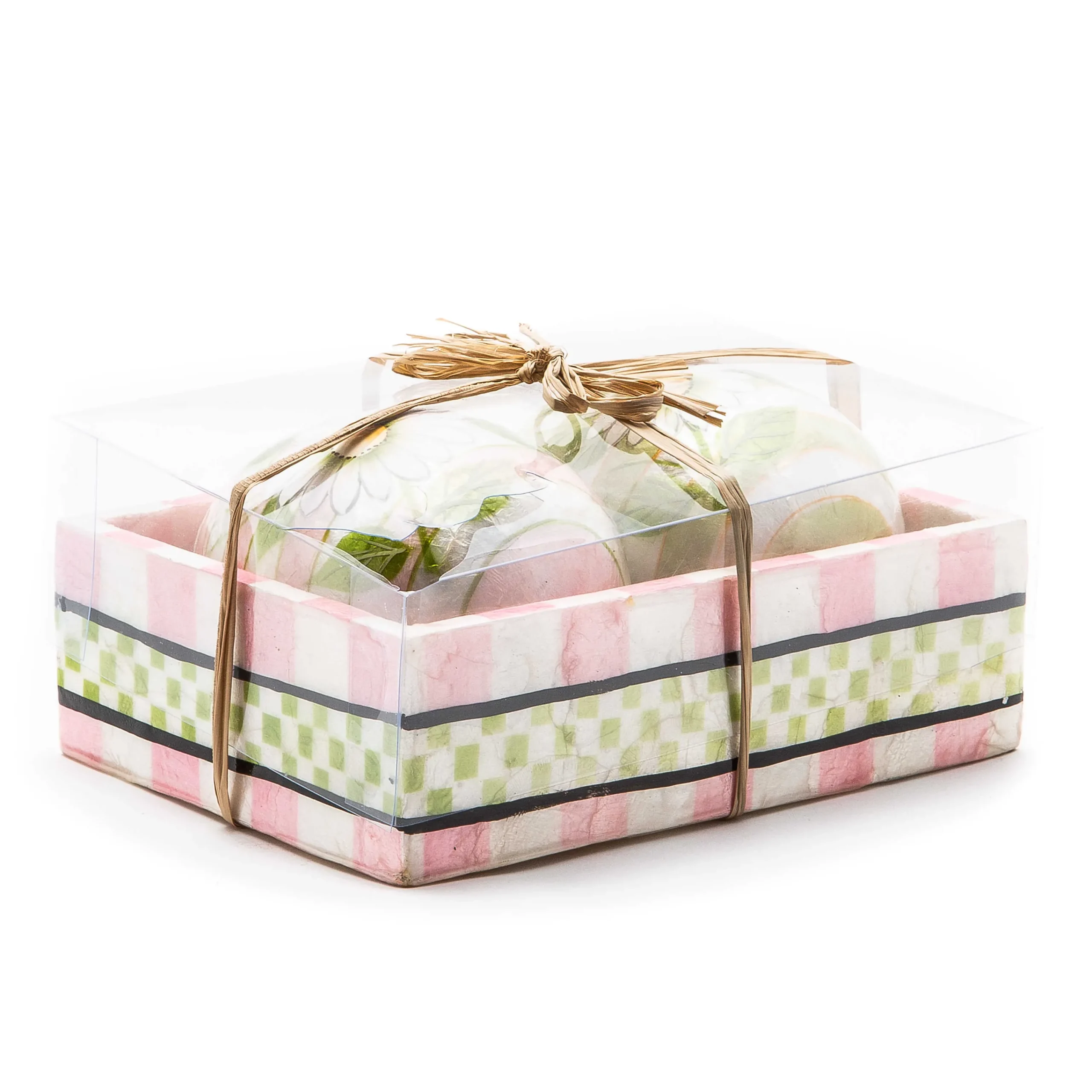 Our Rose Garden Daisy Egg Tray Is Fresh And Fun. Made Of Capiz, Two Hand-Painted Eggs Are Decorated With Daises And Stripes Of Pink And Green And Presented In A Matching Capiz Tray.