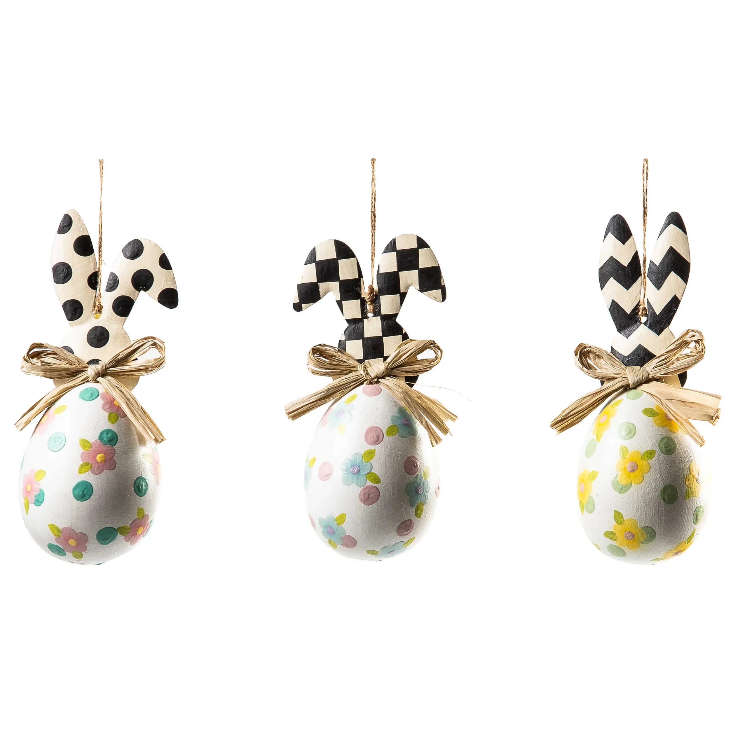 Add Our Set Of Three Rose Garden Rabbit Ornaments To Your Easter Tree Or Displays. The Eggs Are Decorated With Pastel Florals, Topped With Metal Bunny Ears In Checks, Stripes, And Dots, And Finished With Raffia Bows And Jute Loops For Hanging.
