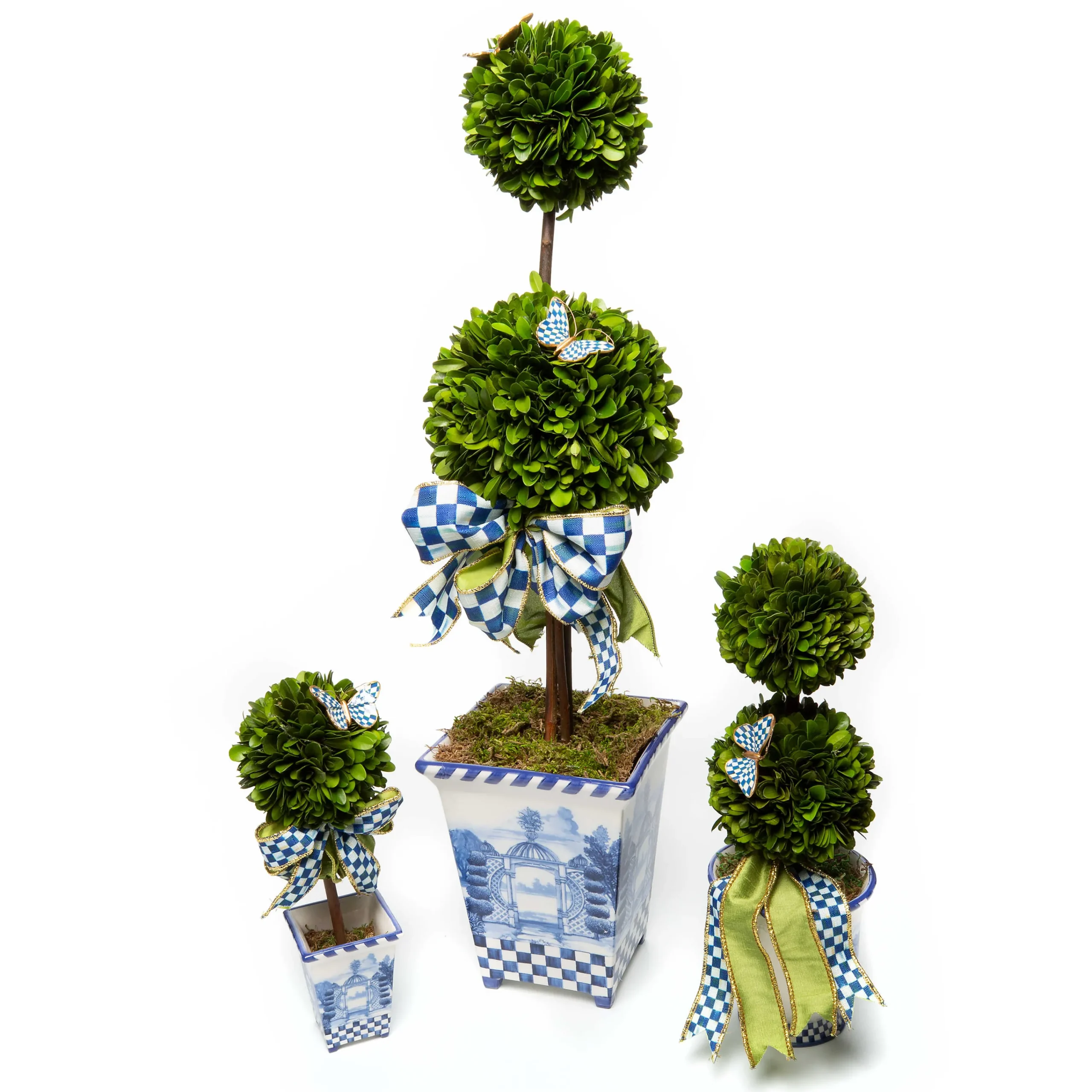 The Preserved Boxwood In Our Medium Royal Boxwood Topiary Is Intricately Woven Together, Looking Effortlessly Elegant In A Ceramic Base That’S Decorated With An Image Of Our Chicken Palace Here On The Farm That Invokes Classic Blue Chinoiserie Style. A Royal Check Butterfly And Ribbon Provide The Finishing Touches. Choose A Pair To Make A Statement Of Style.