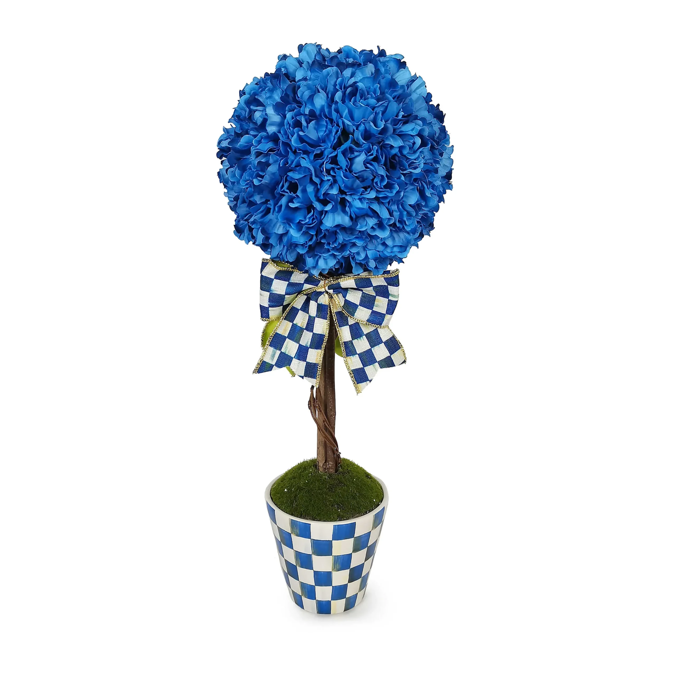 Add Instant Mackenzie-Childs Style With Our Small Royal Check Topiary Drop In. Resembling A Lush Blue Hydrangea, This Everlasting Floral Accent Is Decorated With A Royal Check Bow And Set In A Royal Check Ceramic Base. Display As-Is Or Drop In The Royal Stripe Tabletop Urn Or The Royal Check Pedestal Tabletop Urn (Sold Separately) For An Elevated Presentation.