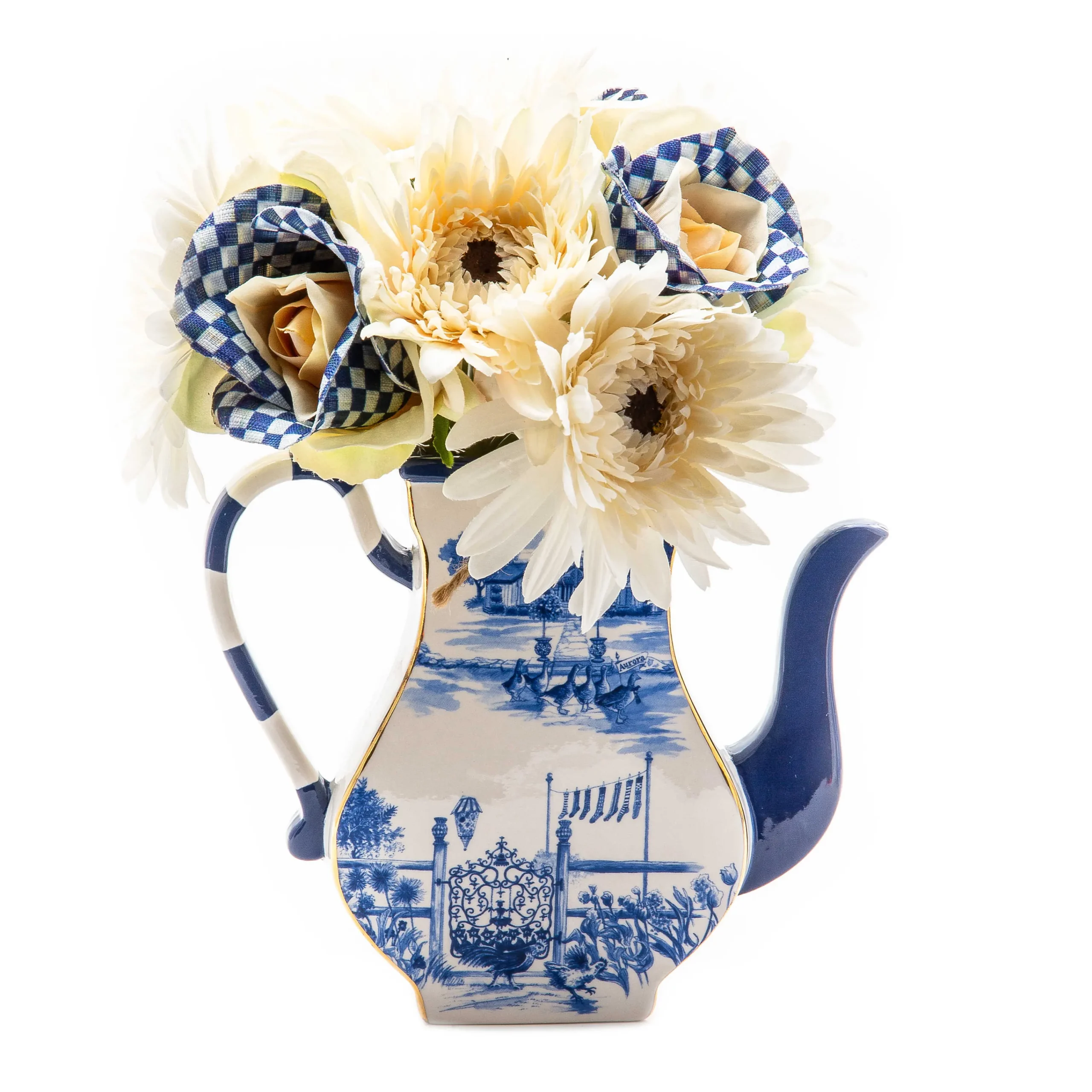 Present Posies In Mc Style With Our Ceramic Royal Toile Teapot Vase. This Teapot-Style Vase Is Decorated With Scenes From Our Aurora Campus, Trimmed With Blue Checks And Gold Lustre Edging.