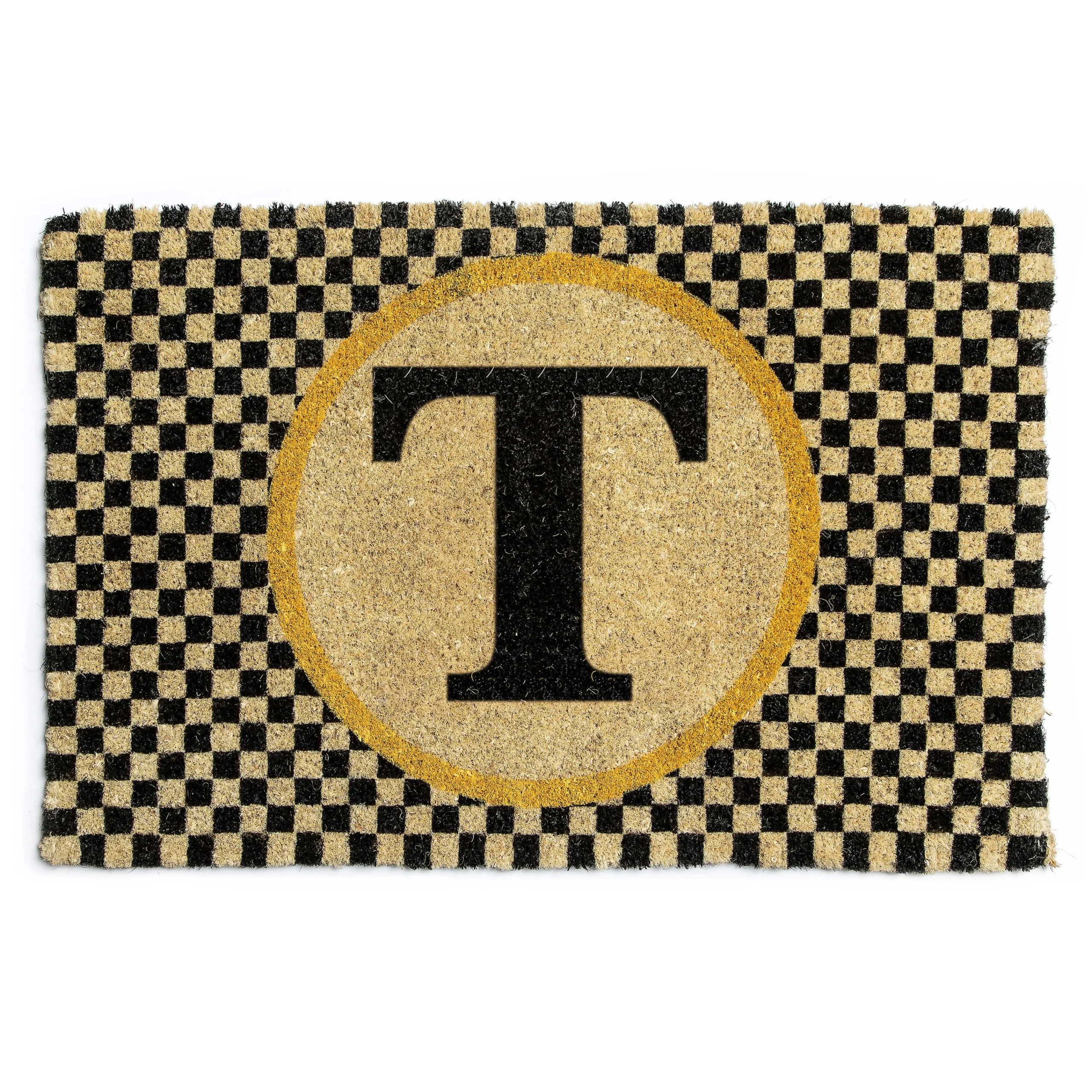 Put Your Stamp On Stylish Salutations With Our T Single Letter Monogrammed Entrance Mat. It’S Made Of Natural Materials With A Bold, Printed Initial Letter In A Field Of Checks. Use It In Protected Areas, And When Its Useful Life Is Over, You Can Recycle This 100% Biodegradable Mat By Burying It In Your Garden!