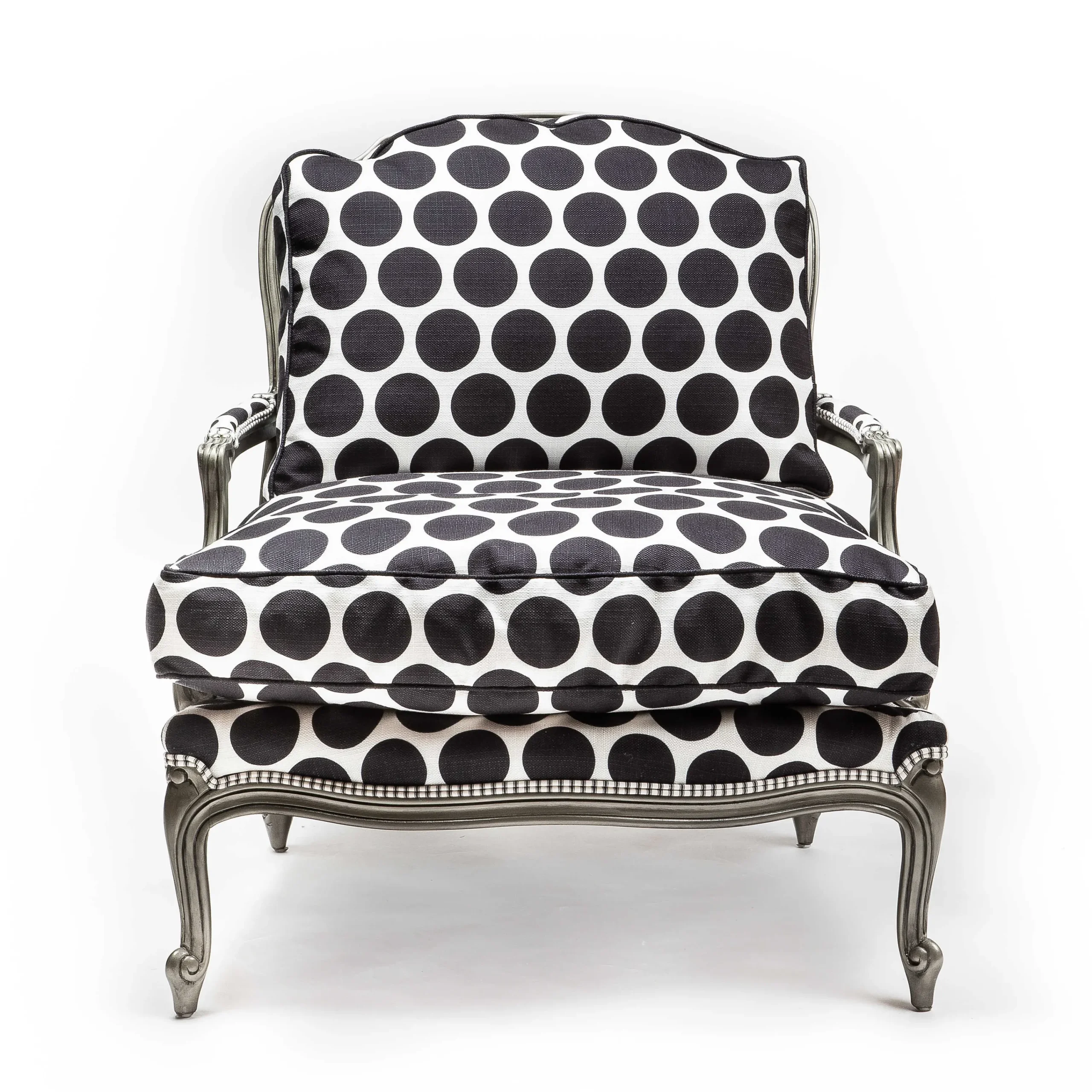 Sit Back And Relax In The Black Spot On Chair. This Seat With Sass Has Bold Black Dots Over A Beechwood Frame With Hand-Applied Pewter Finish. Featuring An Exposed Frame Back And Finished With Black And Ticking Fabric Welts, It Pairs Just Right With The Black Spot On Ottoman.