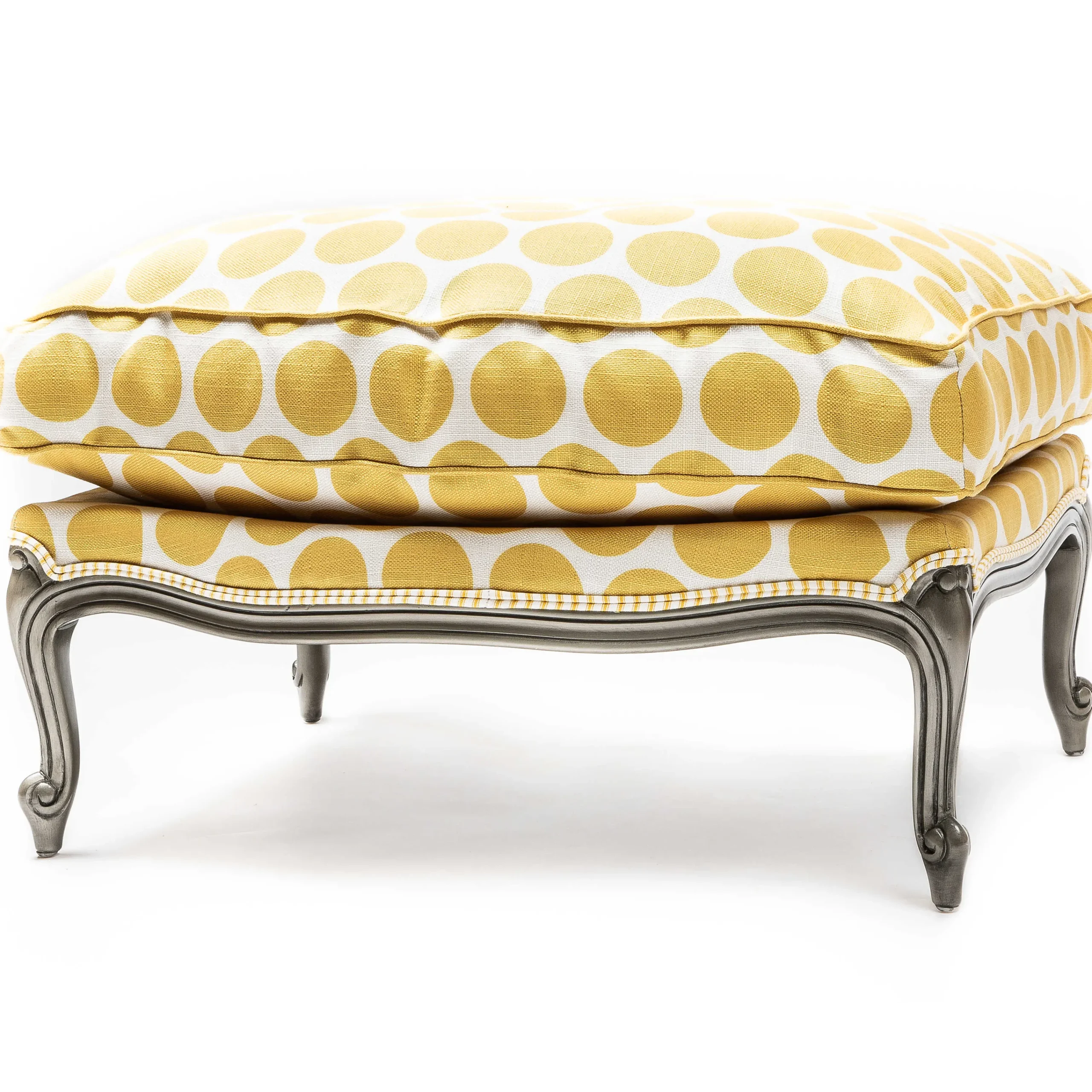 Our Buttercup Spot On Ottoman Is Just That—The Perfect Place To Put Your Feet Up, Especially When Paired With Our Buttercup Spot On Chair. Featuring Bold Buttercup Dots On A Beechwood Frame With Hand-Applied Pewter Finish, It’S Trimmed With Buttercup And Ticking Fabric Welts.
