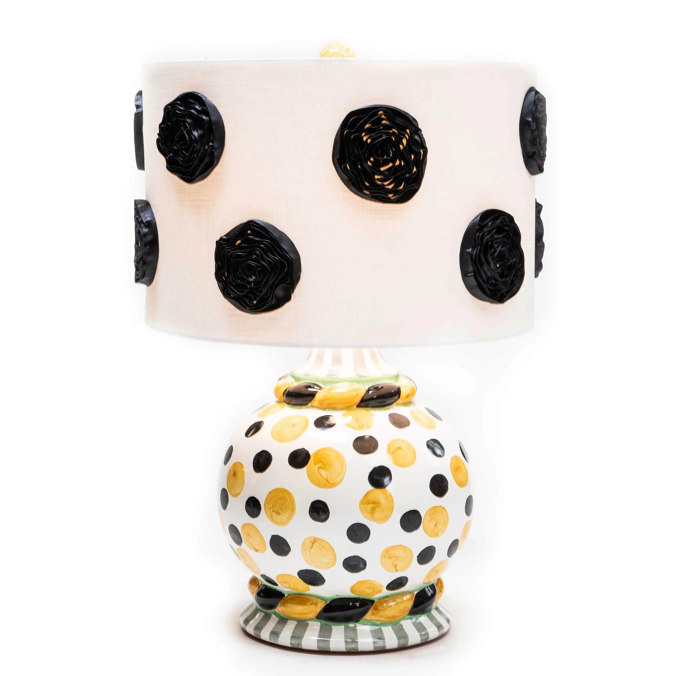 Be Enlightened By Our Spot On Table Lamp. The Ceramic Base And Finial Are Made In Aurora, New York, And Decorated By Our Artisans With An Array Of Hand-Painted Black And Buttercup Dots. It’S Finished With A Polyester Shade Decorated With Oversized Black Ribbon Dots.