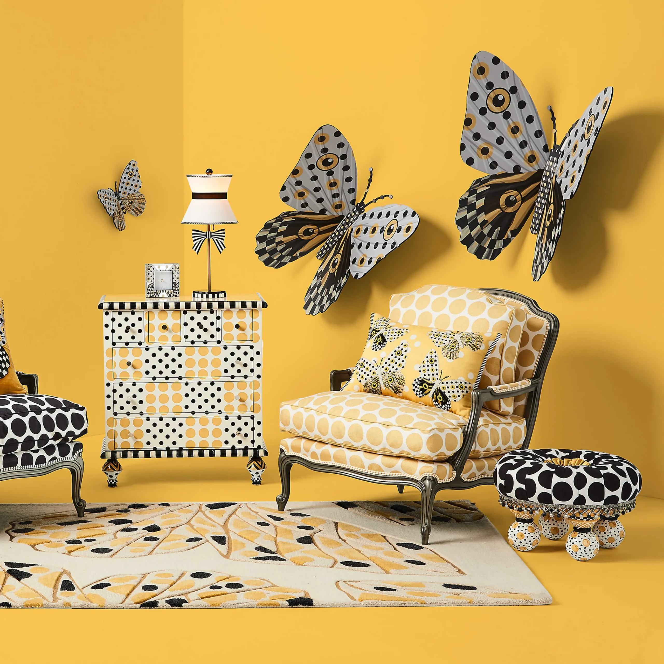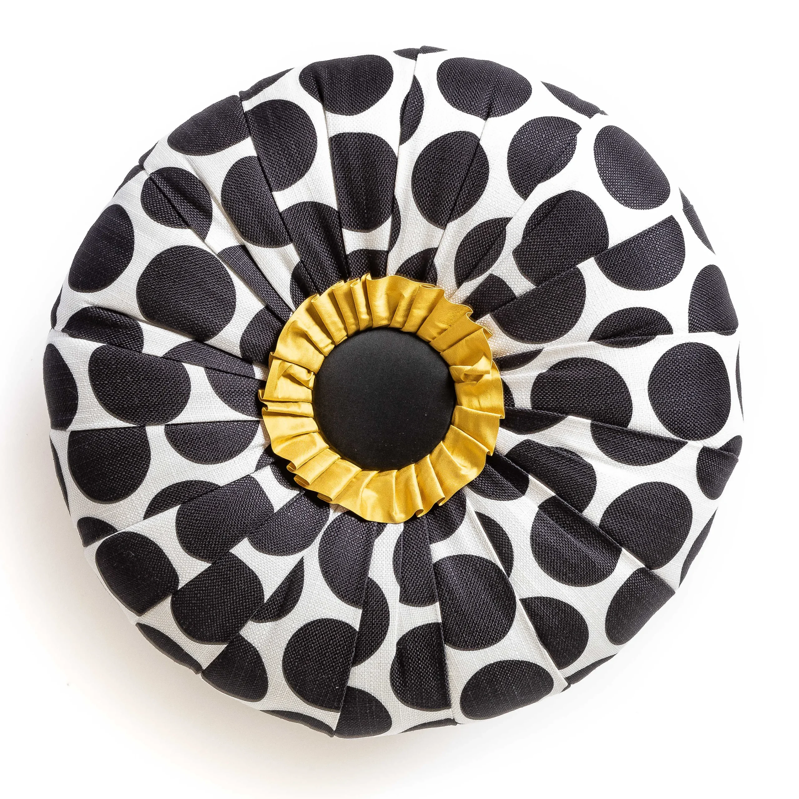 Created Top To Bottom By Our Artisans In Aurora, New York, The Black Spot On Tuffet Is Upholstered In Bold Black Dots, Accented With A Fabric-Covered Button Outlined With A Pleated Ribbon Ruff In Its Center, And Trimmed With Threaded Ball Fringe. This Playful Perch Sits On Four Handmade, Hand-Glazed Majolica Legs, Hand-Painted With Black And Buttercup Dots.