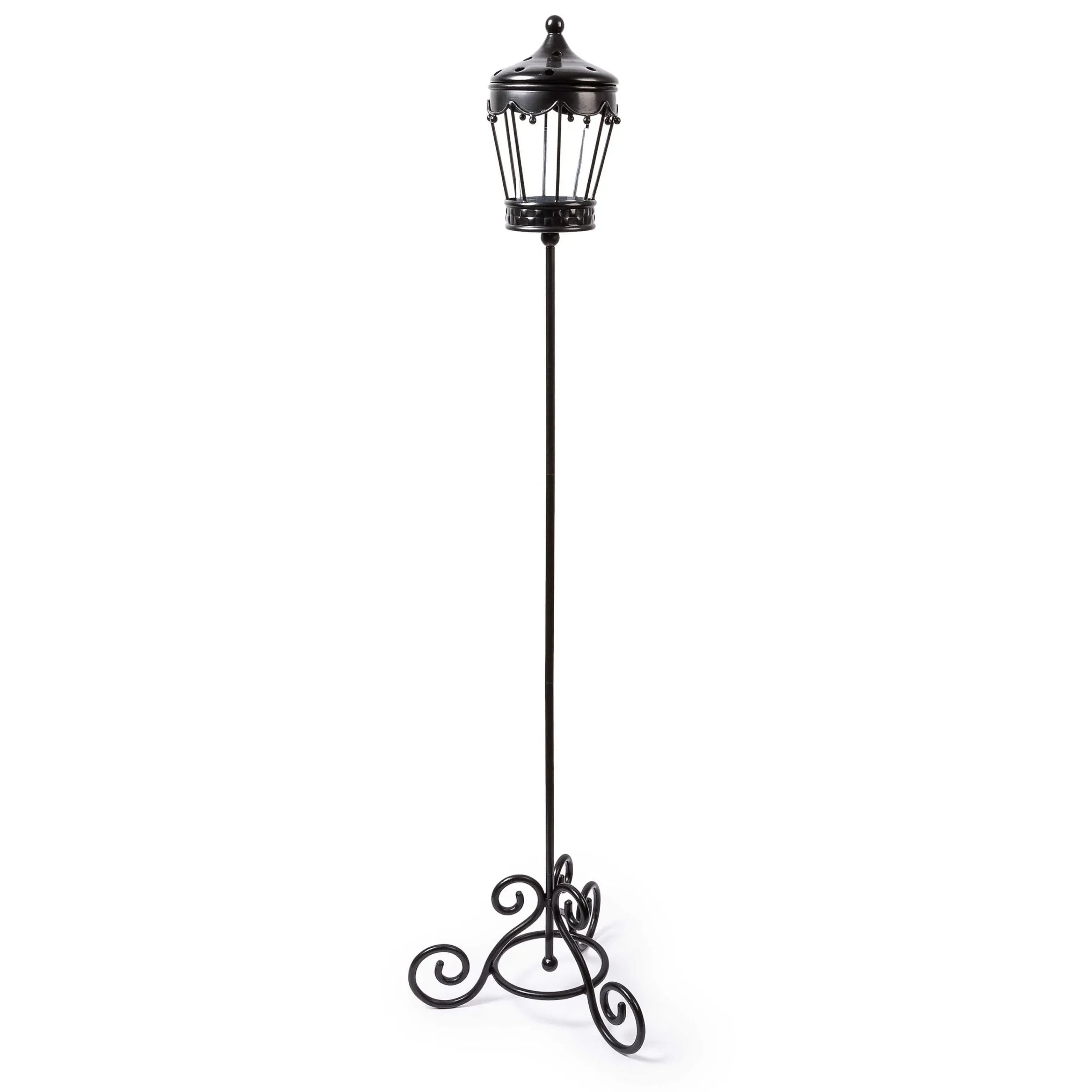 Keep The Party Going After Dark With Our Standing Garden Lantern. Made Of Aluminum And Featuring Debossed Checks On Its Base, It On A 56” Stand That Rests On A Scrolled Triangular Base. It Holds A Pillar Candle Behind Glass Panels.