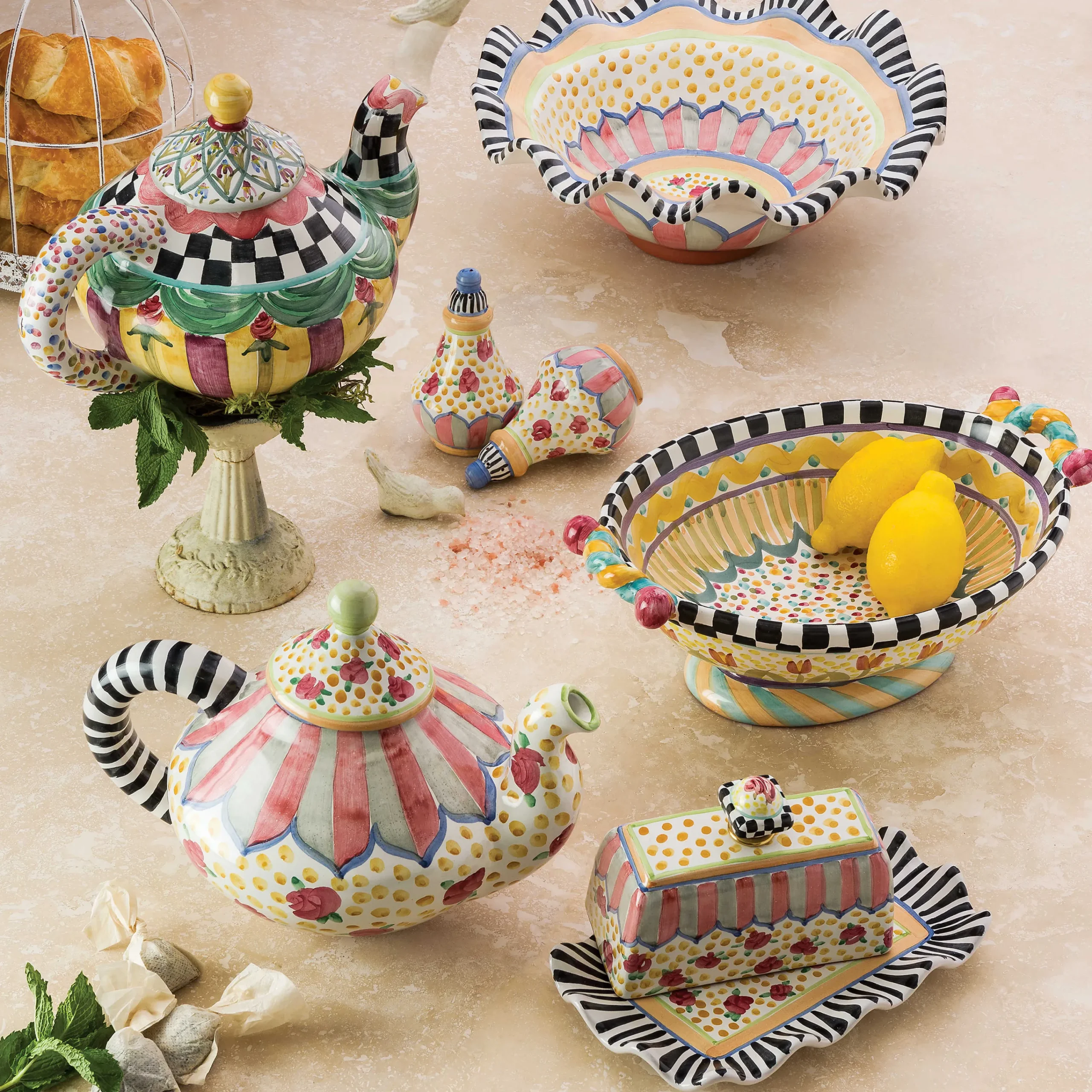 This Fanciful Design—With A Basin Of Light, Bright Squiggles, Spots, And Stripes In Lemon And Sky Hues—Fits In Easily With Your Favorite Taylor Patterns And Seems To Work Everywhere Else Too, Making The Odd Fellows Large Footed Serving Dish The Perfect “Completer” To Your Taylor Ceramic Tabletop Servingware Collection. Every Inch Of The Handmade Majolica Body Is Hand-Painted And Handcrafted. Each One Bears The Stamps Of The Artisans Who Created It. Generously Sized For Side Dishes And Salads And As The Star Of The Buffet Table. Order A Run Of Them To Span The Sideboard.