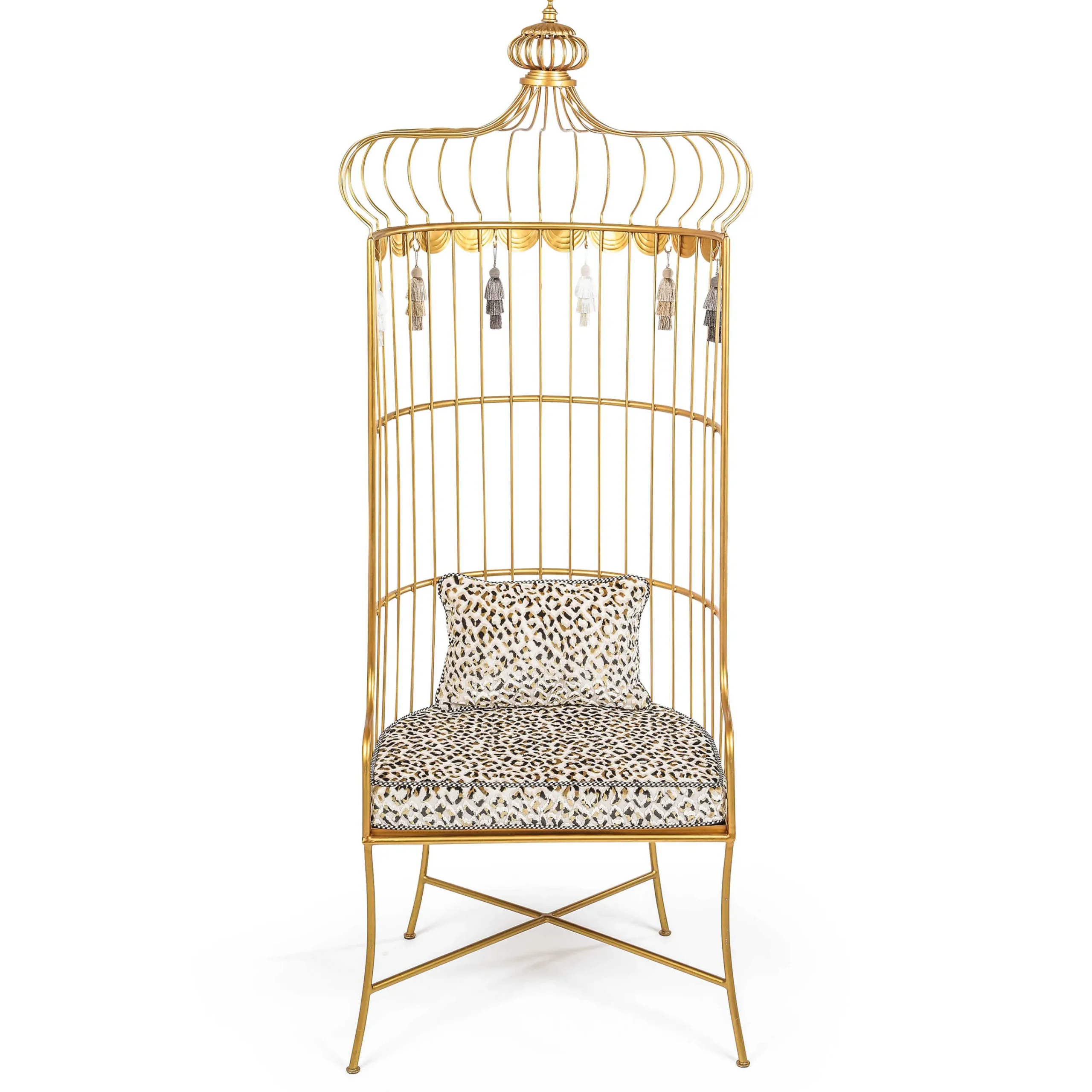 Allow Us To Tweet About Our Aviary Chair, A Gilded Perch Like No Other. Its Uniquely Shaped Powder-Coated Iron Frame Offers A Seat Cushion And Toss Pillow That Reverse From Ocelot Pattern To Our Cotton-Linen Blend Courtly Check®, Trimmed With Black And White Checked Cording. The Finishing Touch Are Six Three-Tiered, Ombre-Colored Tassels That Hang Between The Chair’S Metal Swags.