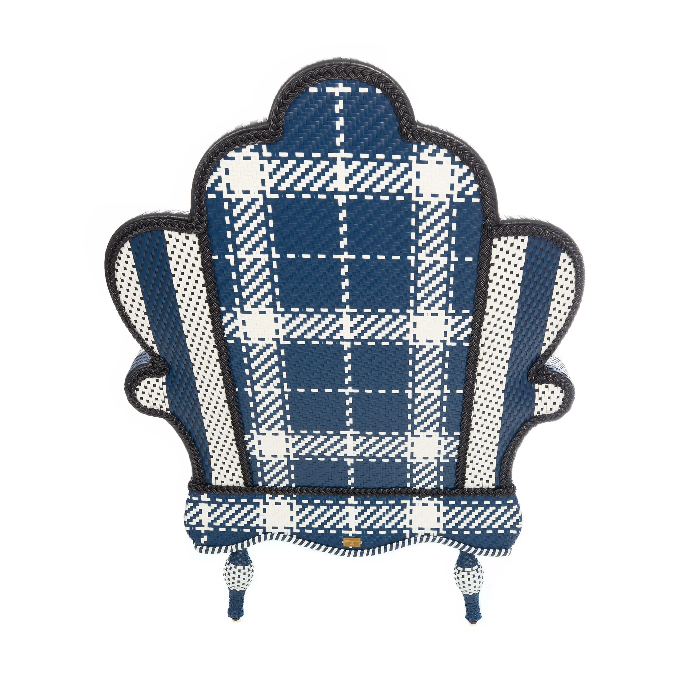 Take Wicker Up A Notch With Our Boathouse Outdoor Wing Chair. It’S Made Of Weather-Ready Handwoven Resin Wicker In A Brightly Bold Geometric Plaid And Stripe Pattern Done In Navy And White, Wrapped On Powder-Coated Iron And Set With A Reversible Sunbrella® Cushion That’S Royal Dots On One Side And Royal Checks On The Other.