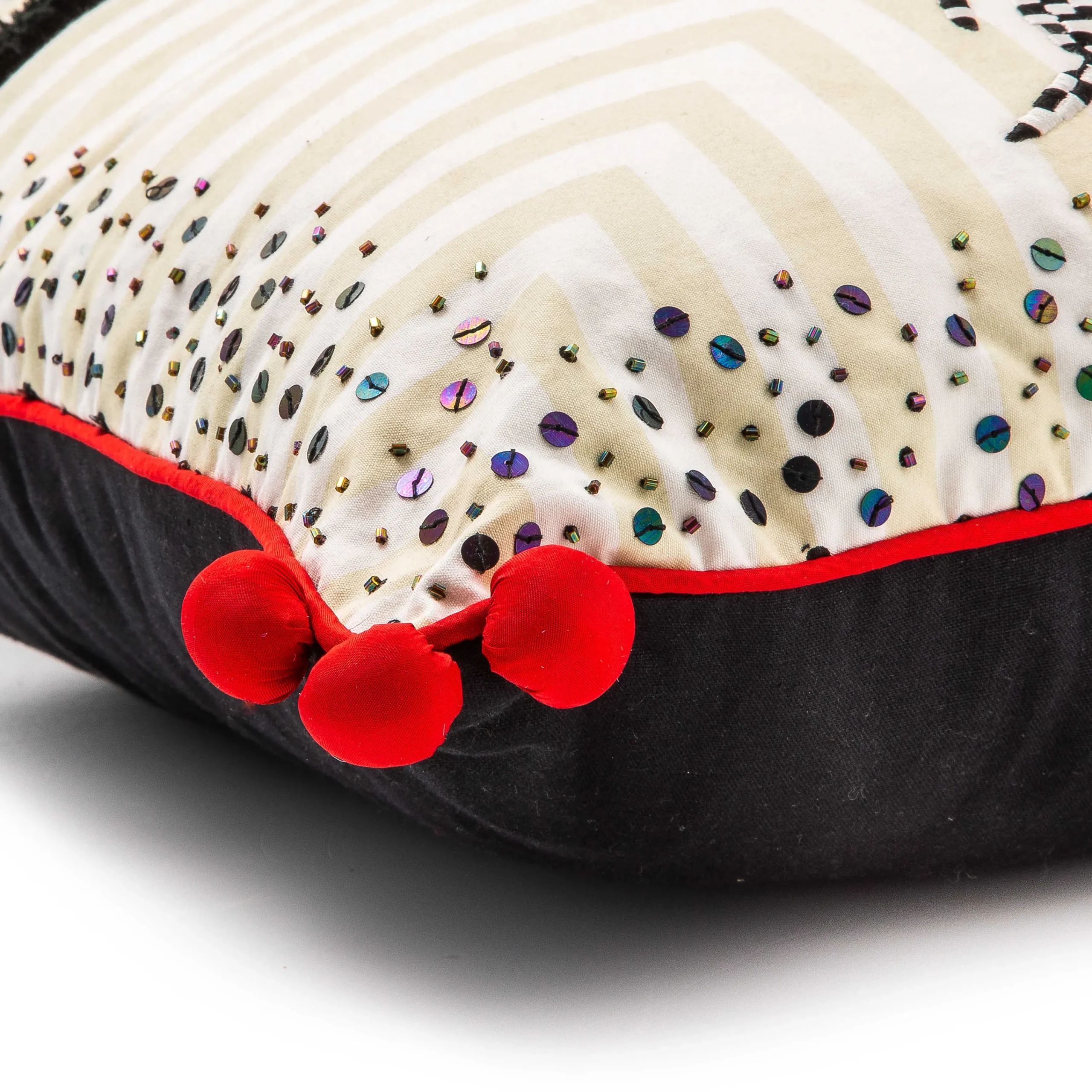 Rise And Shine With Our Chicken And Rooster Lumbar Pillow. Its Printed Front Is Embellished With Chenille Embroidery, Beading, And Sequins, Trimmed With Red Piping And Handmade Fabric Pom-Poms On The Corners.