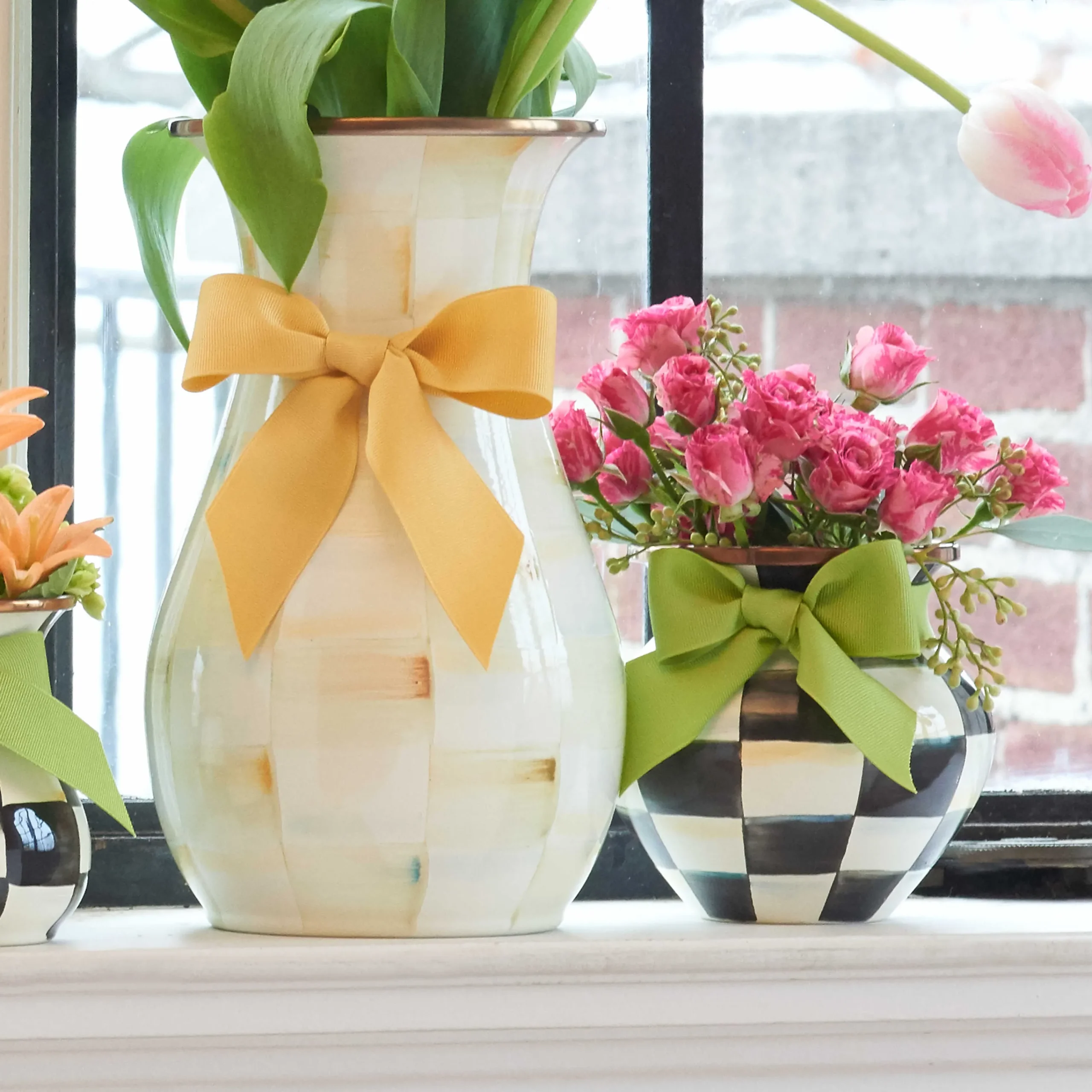 Petite And Poised, For Flowers, Paint Brushes, Pencils…(You Might Need More Than A Few!). The Sturdy Steel Underbody Of Our Courtly Check® Enamel Vase Is Adorned With Hand-Painted Checks And A Green Bow, And Rimmed In Bronzed Stainless Steel.