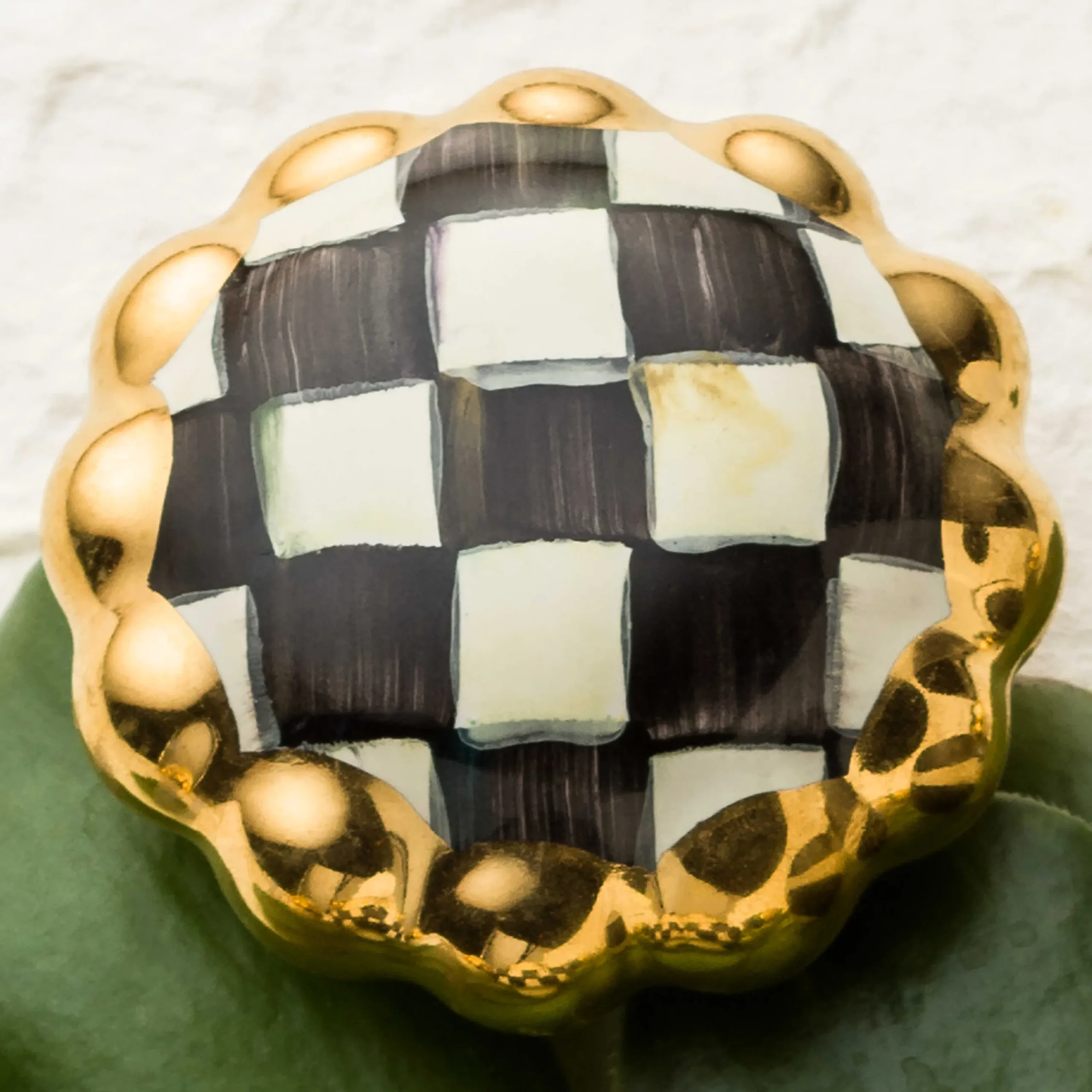While Quite Handsome From Any Distance, The Intricate Splendor Of Our Courtly Check® Round Knob Emerges Upon Closer Inspection. Hand-Painted Onto A Scalloped Silhouette Of Hand-Glazed Ceramic, Our Signature Black And White Checks Have A Dash Of Rich Jewel Tones Woven Into Each Brushstroke. A Wide, Glittering Band Of Gold Lustre Frames Each One-Of-A-Kind Knob. Coordinate With Our Courtly Check® Dinnerware For A Kitchen Marked By Signature Style, Or Use As A Drawer Pull On An End Table Featuring One Of Our Equally Resplendent Lamps.