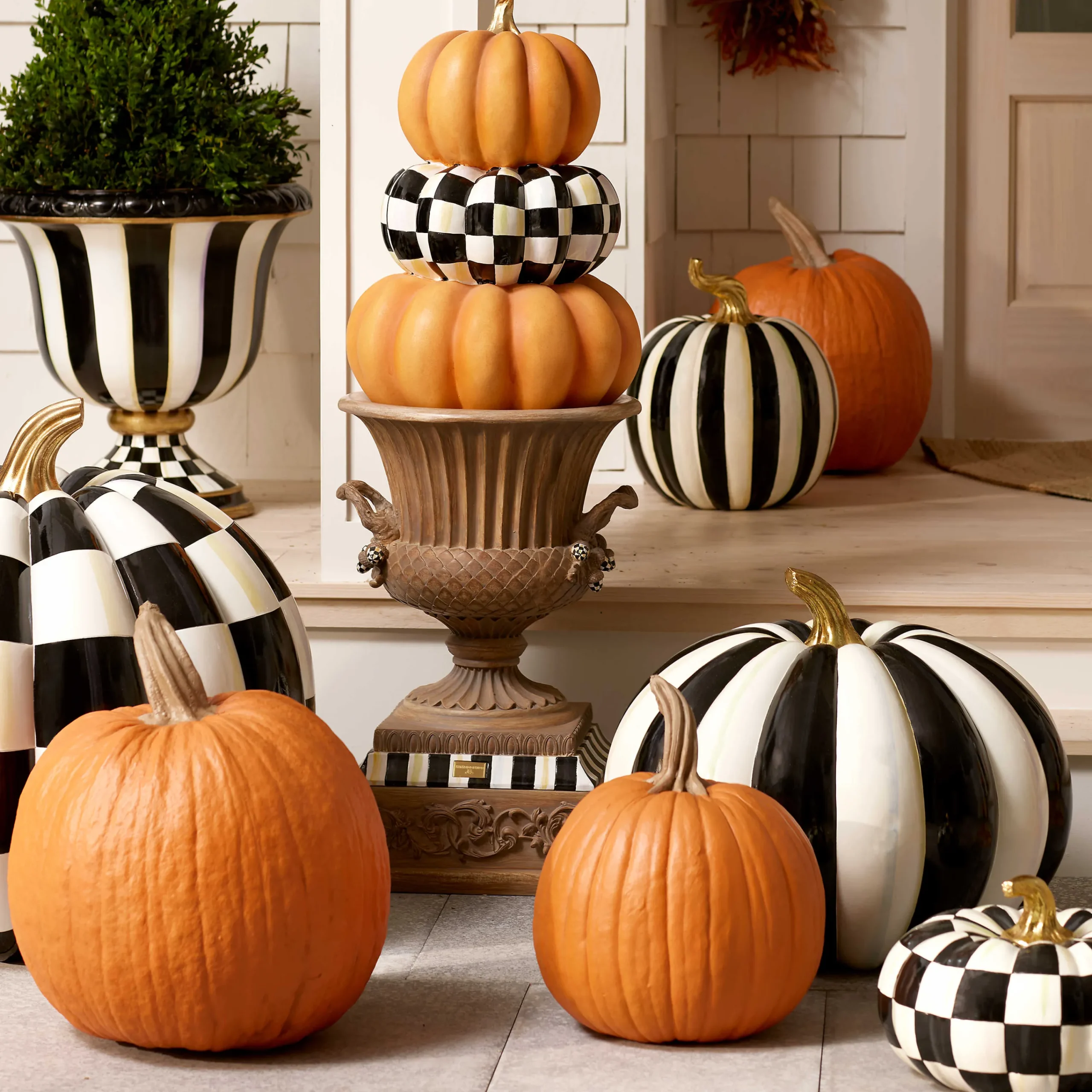 Elevate The Presentation Of Our Stacked Seasonal Accents With The Weather-Resistant Courtly Stripe Pedestal Urn. Crafted Of Durable Fiberglass And Resin, It’S Hand-Painted With Our Signature Black And White Stripes. There Is A Drainage Hole In The Bottom, So You Can Add Your Own Plants As Well.