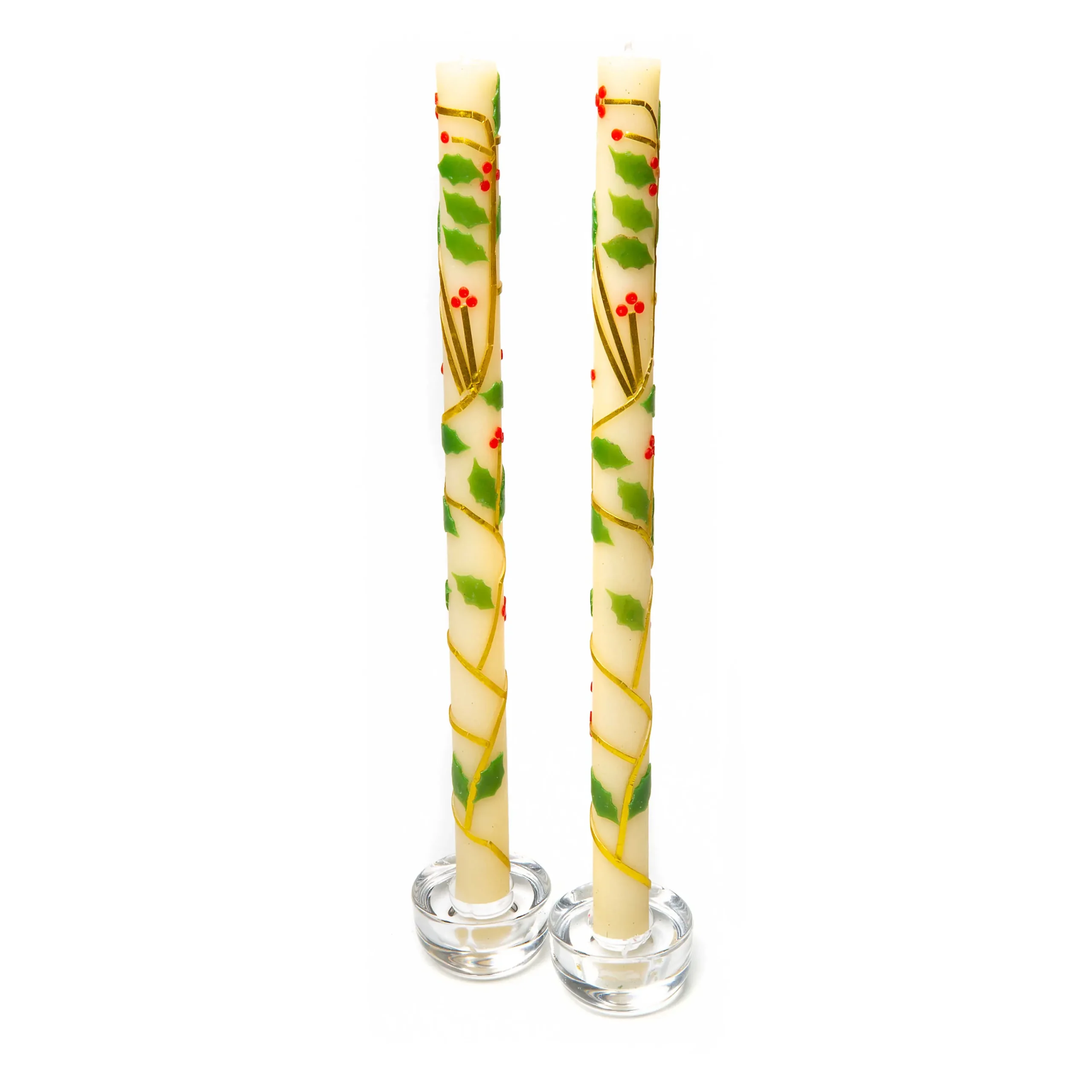 The Flicker Of Candlelight Dances Beautifully Atop Our Holly Dinner Candles. A Blend Of Beeswax And Paraffin, This Set Of Two Candles Is Embellished With Appliques Of Wax Arranged In A Pattern Of Holly Leaves And Berries.