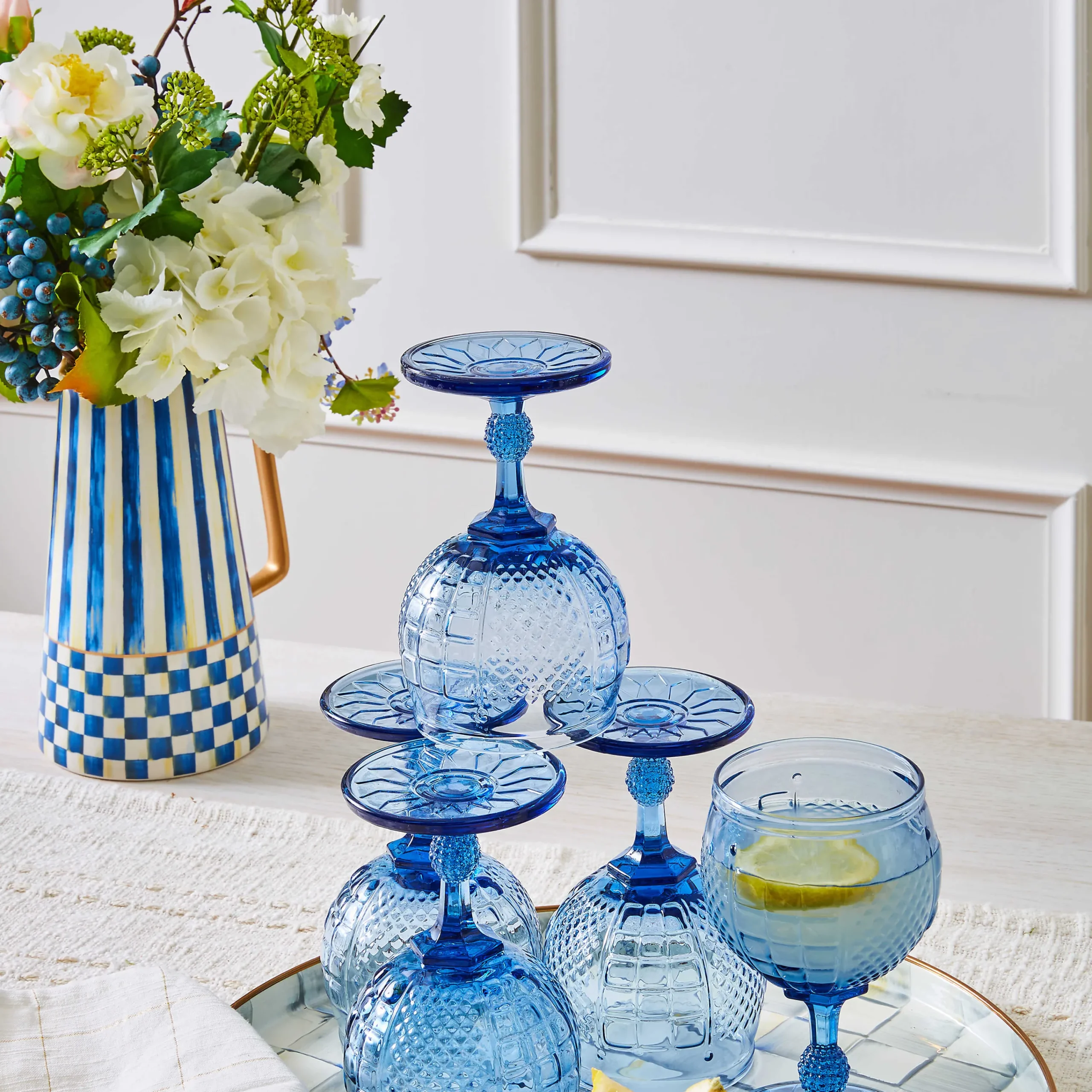 Our Royal Fresh Cut Arrangement Is Blue-Tiful, With Everlasting White Silk Anemones, Accented With Dogwood Blossoms, Bunches Of Blue Berries, And Leaves Of Royal Check, Presented In A Ceramic Pitcher Decorated With Our Signature Blue Patterns.