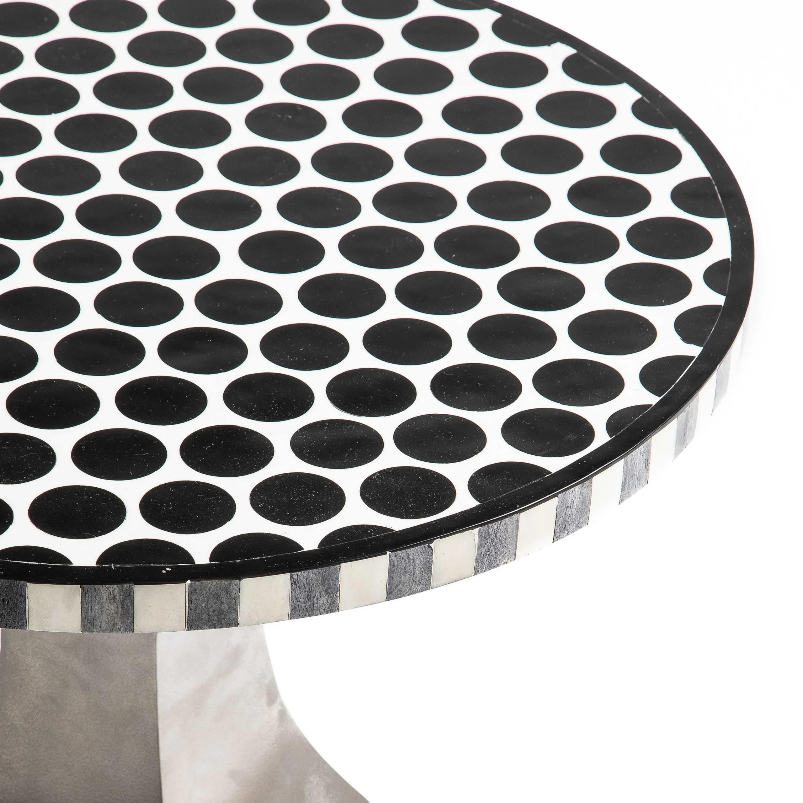 The Black Spot On Accent Table Is Aptly Named Because It’S The Perfect Spot For A Small Lamp Or Parking Your Favorite Book. Featuring Bold Black Dots On Its Wood And Resin Top, Trimmed With Striped Bone Inlay, It Sits On An Iron Pedestal Frame.