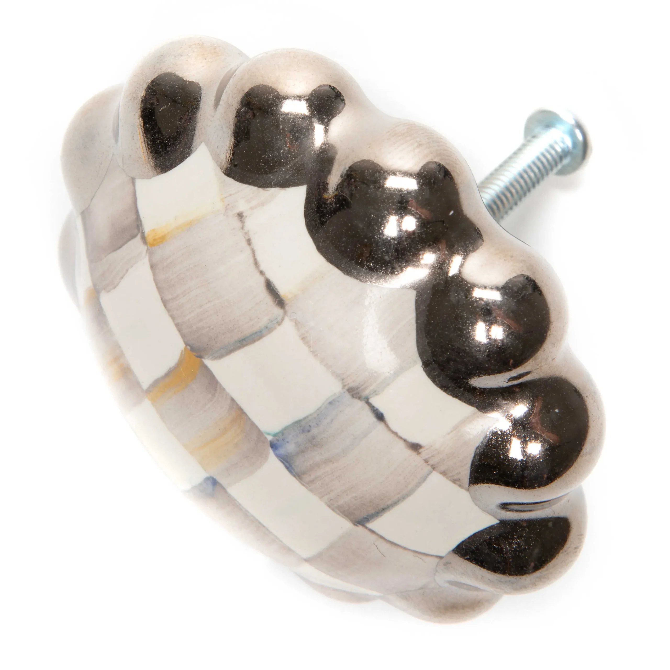 Hand-Painted Onto A Scalloped Silhouette Of Hand-Glazed Ceramic, The Sterling Check Round Knob Features Our Color-Dragged Grey And White Checks, Framed In Platinum Lustre. Coordinate With Our Sterling Check Dinnerware For A Kitchen Marked By Signature Style Or Use As A Drawer Pull On An End Table.