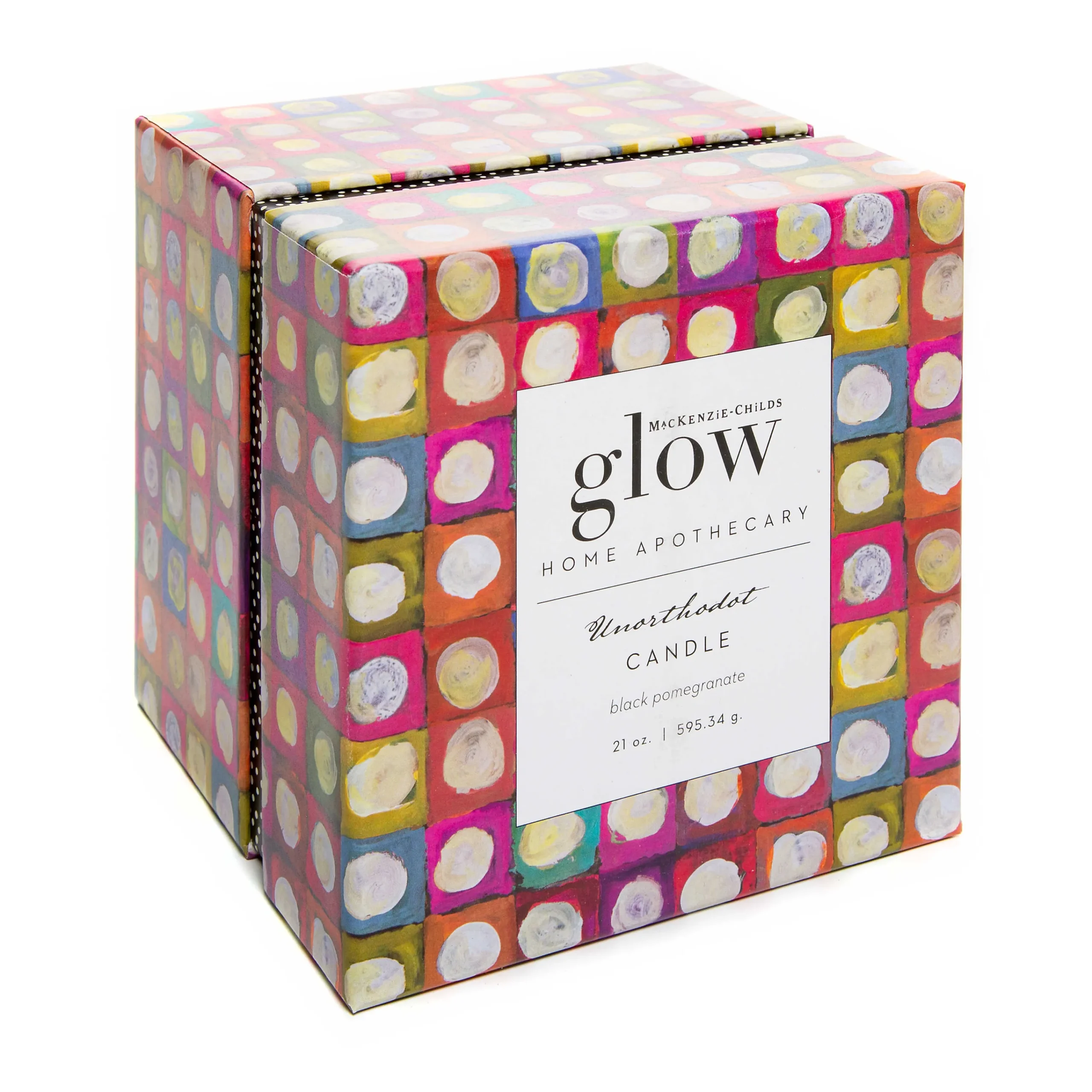 Mackenzie-Childs Glow Home Apothecary Defines The Essence Of Home With Fresh And Inviting Scents. Be Enlightened By Our 21-Ounce Unorthodot Candle, Which Is A Blend Of Palm And Paraffin Waxes With The Scent Of Fruity Black Pomegranate With A Woody Finish. This Candle, Which Burns Up To 66 Hours, Is Presented In A Checked Glass Vessel That Comes With A Metal Lid To Preserve The Scent When It Is Not Burning.